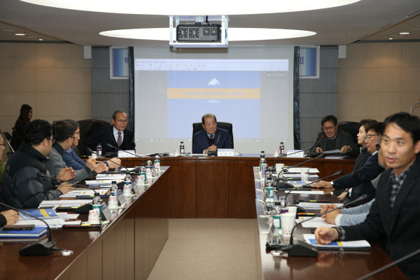 30일 오후 마포구청 8층 대회의실에서 '박영석 산악문화체험센터 공간연출 등 기본계획 용역 최종보고회'가 열렸다. 사진은 구청장 및 직원들이 이야기를 나누는 모습. (사진제공=마포구청)