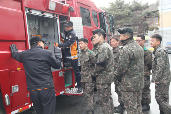 서울 관악소방서는 31일 소방서 후정에서 수도방위사령부 자체소방대원을 대상으로 소방차 운용능력 향상을 위한 특별교육을 실시했다. 이날 교육은 부대 내 자체소방대원들이 소방차의 조작기술과 운용능력 향상을 통해 각종 화재현장에서 현장대응능력 강화 및 완벽한 진압작전 수행을 위해 실시됐다. 사진은 교육이 진행 중인 모습. (사진제공=관악소방서)
