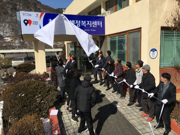 최근 경기 연천군은 군수와 군의장, 도의원, 청산지역 사회단체장, 지역원로 등 지역주민이 참석한 가운데 ‘청산면 행정복지센터 개청식’을 개최했다. 사진은 행사에 참석한 관계자들이 센터 현판 제막식에 참여하고 있는 모습. (사진제공=연천군청)