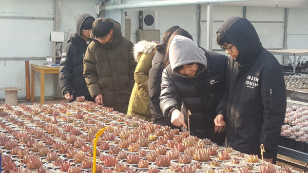 경기 수원시 권선구 입북동은 지역 청소년을 대상으로 ‘그린나래 봉사단’을 모집하고 30일 시설재배농가에 대한 견학 및 일손돕기 프로그램을 진행했다. 사진은 봉사단원들이 새싹채소, 다육식물 등의 다양한 생산물을 관찰하는 모습. (사진제공=권선구청)