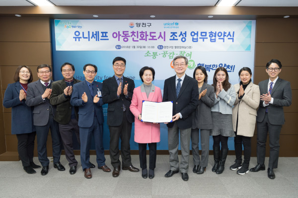 30일 서울 양천구가 유니세프한국위원회와 '유니세프 아동친화도시 조성 업무협약식'을 맺고 아동친화도시 조성을 위한 본격적인 사업에 박차를 가한다. 사진은 협약식 후 기념촬영을 하고 있는 관계자들의 모습. (사진제공=양천구청)
