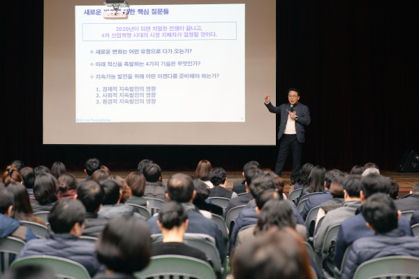 동대문구는 31일 오후 4시 구청 다목적 강당에서 직원을 대상으로 한 ‘4차 산업혁명 특강’을 실시했다. 사진은 이경상 카이스트 교수가 ‘세상을 바꾸는 4차산업혁명’ 특강을 진행하는 모습. (사진제공=동대문구청)