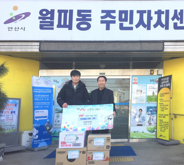경기 안산시 월피동에 위치한 연세한미태권도는 지난 30일 어려운 이웃에 전해달라며 관원들이 십시일반 모은 라면을 월피동행정복지센터에 전달했다. 사진은 관계자들이 기념촬영을 하는 모습. (사진제공=안산시청)