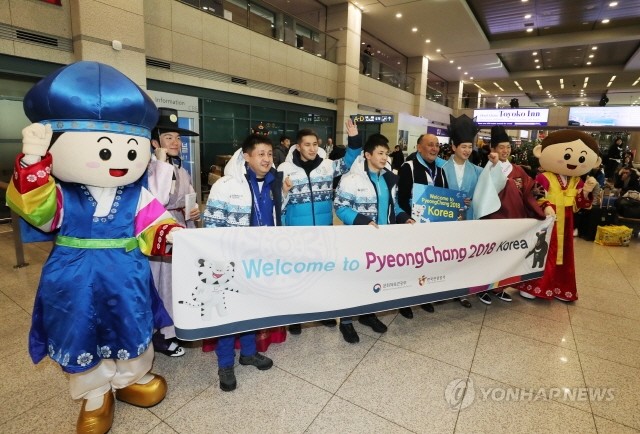한국관광공사 도우미들이 1일 오전 인천국제공항 제1여객터미널 입국장에서 평창올림픽을 위해 한국을 찾은 외국인 방문객들을 반기고 있다.