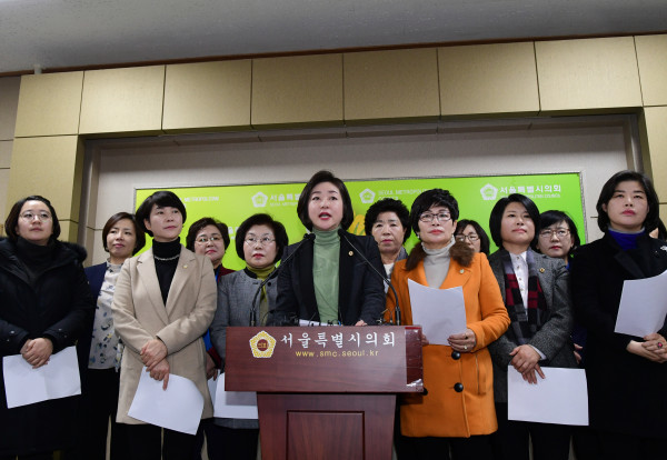 더불어민주당 전국여성지방의원협의회 회원 11명은 1일 서울시의회에서 기자회견을 열고, ‘서지현 검사 성폭행 사건’과 관련, 철저한 진상규명과 제도개선을 촉구했다. 사진은 기자회견에 참석한 협의회 회원들이 성명을 발표하고 있는 모습. (사진제공=서울시의회)