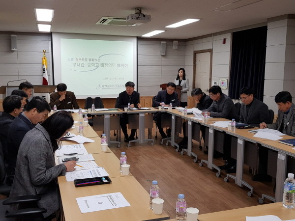 충남 아산교육지원청은 지난 1일 2018학년도 중학교 신입생 배정 결과에 따른 문제점 해결책 마련 및 온양학군 중학교의 균형있는 발전을 위해 관련 부서 간 소통과 협력의 시간을 가졌다. 사진은 관계자들이 회의하고 있는 모습.(사진제공=아산교육지원청)