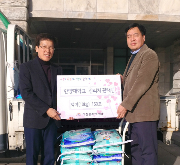 서울 성동구 소재 한양대학교가 지난달 29일 설을 맞이해 지역내 저소득 취약계층을 위해 사용해달라며 백미(10kg) 150포를 마장동 주민센터에 기탁했다. 사진은 동 및 대학 관계자가 백미 기탁식 후 기념촬영을 하는 모습.(사진제공=성동구청)