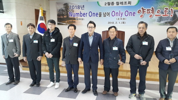 경기 양평군은 최근 월례조회에서 친환경 농업 및 강소농 육성 정책의 일환으로 ‘농업소득 1억 이상 달성’ 농가 18곳에 대해 기념탑을 수여했다. 사진은 1억 달성 기념탑을 수여받은 관계자들이 기념촬영을 하는 모습.(사진제공=양평구청)