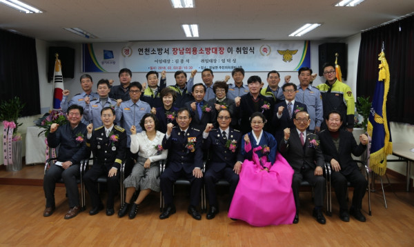 최근 경기 연천소방서는 장남면 주민자치센터에서 소방서장과 도·군의원, 의용소방대원 등이 참석한 가운데 ‘장남면 남성의용소방대장 이·취임식’을 개최했다. 사진은 이·취임식 후 관계자들이 기념촬영을 하는 모습. (사진제공=연천소방서)