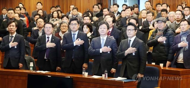 5일 오전 국회 헌정기념관에서 열린 바른정당 당원대표자회의에서 참석자들이 국기에 경례하고 있다.