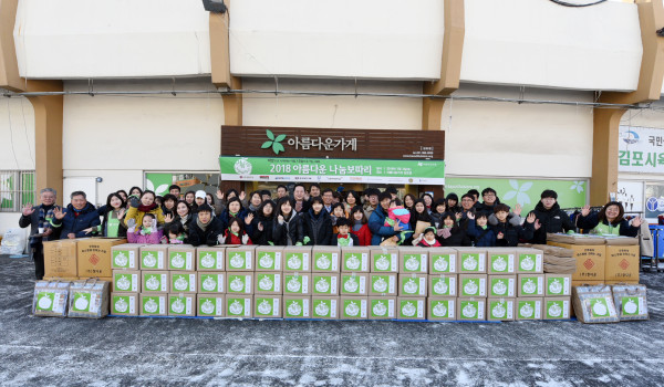 아름다운가게 경기 김포점이 지난 3일 자원봉사자인 배달천사 100여명이 참석한 가운데 지역내 홀몸노인 가구를 직접 방문해 선물을 전달하는 ‘아름다운 나눔보따리’ 행사를 개최했다. 사진은 전달에 앞서 기념촬영을 하는 모습. (사진제공=김포시청)