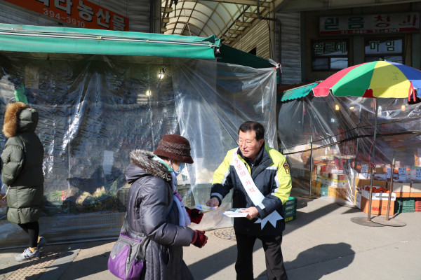 경기 군포소방서는 지난 5일 산본시장 일대에서 소방차 길 터주기 및 전통시장 화재안전관리 강화 캠페인을 펼쳤다. 사진은 소방서 관계자가 시민에게 겨울철 화재예방 홍보 및 안전대동여지도 리플릿을 배부하는 모습. (사진제공=군포소방서)