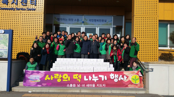 경기 포천시 소홀읍 새마을남녀지도자회는 최근 소홀읍 행정복지센터 광장에서 지역내 취약계층들이 설 명절을 따뜻하게 보낼 수 있도록 하자는 취지에서 ‘사랑의 떡 나누기’ 행사를 개최했다. 사진은 행사에 참여한 관계자들이 기념촬영을 하는 모습. (사진제공=포천시청)