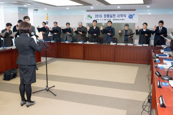 서울 은평구가 지난 5일 구청 모든 간부공무원이 참석한 가운데‘청렴실천 서약식’을 진행해 부패를 용납하지 않는 엄정한 자세로 업무를 대할 것을 서약했다. 사진은 서약식에서 선서를 하고 있는 구청 간부공무원들 모습. (사진제공=은평구청)