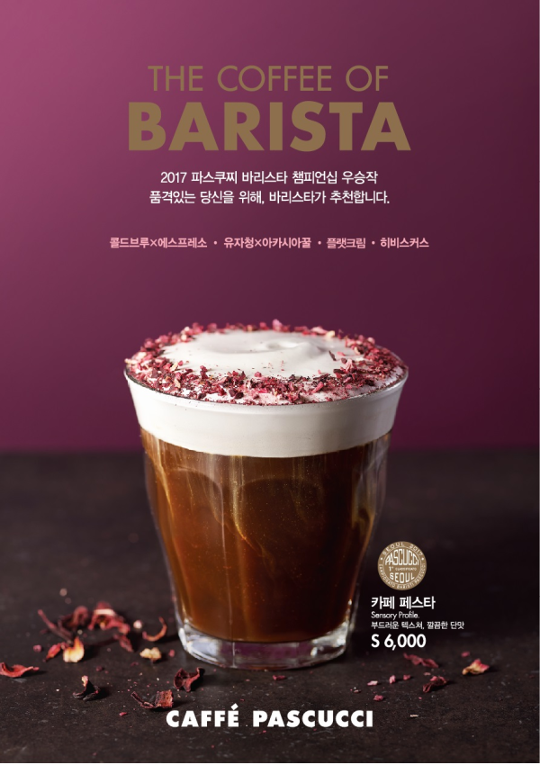 7일 파스쿠찌에 따르면 이번에 판매되는 음료는 지난해 9월 전국 매장 바리스타를 대상으로 진행된 ‘2017 파스쿠찌 바리스타 챔피언십’에서 1위를 차지한 포항지곡점의 김성목 ‘바리스타의 카페 페스타(6,000원/S)’다.