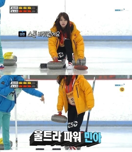 여자 컬링 준결승전에는 달샤벳과 걸스데이가 대결을 펼쳤다. 걸스데이가 앞서있는 상황에서 민아가 다음주자로 나섰지만 민아가 밀려는 스톤이 달샤벳 것과 바뀌었다. 심판의 지적을 들은 민아는 그 자리에서 스톤을 번쩍 들어 뒤로 이동하는 모습으로 웃음을 자아냈다.