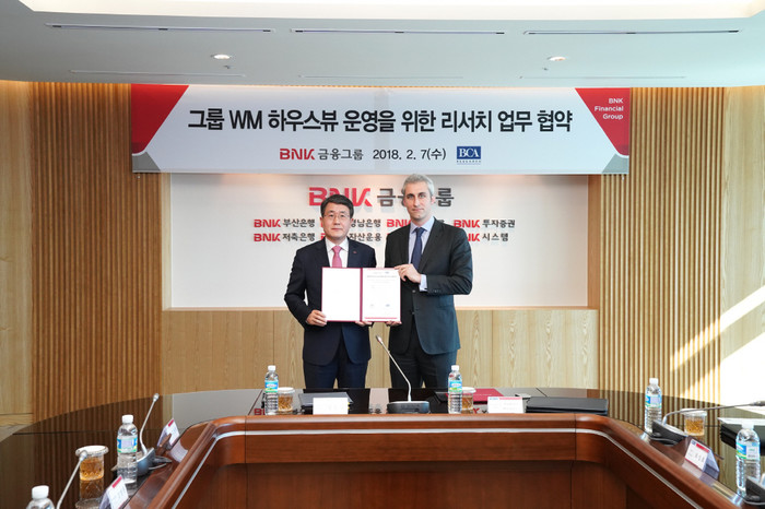 [부산=최성일 기자]BNK금융그룹(회장 김지완)은 2월 7일(수) 오후, 부산은행 본점에서 글로벌 독립리서치 기관인 캐나다의 ‘BCA리서치(BCA Research)’와 업무제휴를 체결했다.