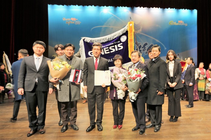 | ▲ 제너시스 BBQ관계자들이 경북 포항시청에서 열린 ‘포항지진 지원 자원봉사 유공 포상 수여식’에서 ‘경상북도지사 감사패’를 수상한 후 기념촬영을 하고 있다.(사진제공=제너시스BBQ) | ||