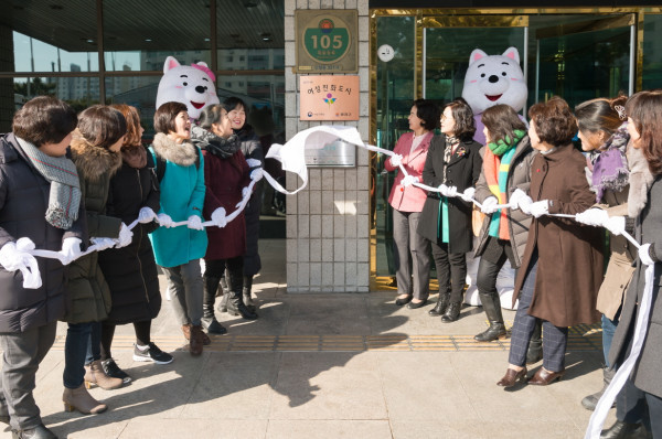 7일 '2017 신규 여성친화도시로 지정'된 양천구청이 구청 1층 현관 앞에서 '여성친화도시 현판식'을 개최했다. 사진은 현판식을 진행하고 있는 구청장과 참가자들의 모습. (사진제공=양천구청)