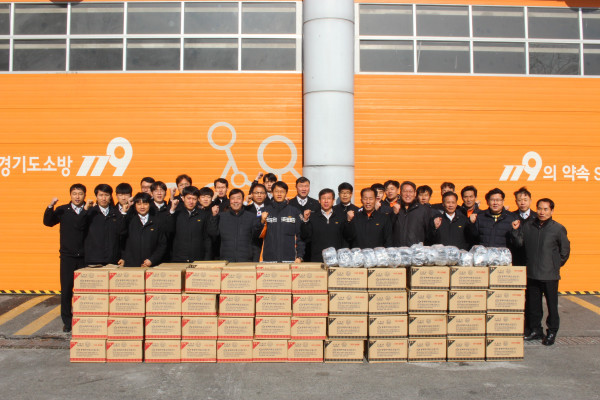 경기 이천소방서는 7일 이천시청으로부터 소방수관 350개와 산불진화장갑 170켤레 등 산불예방 및 산불진화를 위해 필요한 장비를 지원받았다. 사진은 장비기탁식에 참석한 시청 및 소방서 관계자들이 기념촬영을 하고 있는 모습. (사진제공=이천소방서)