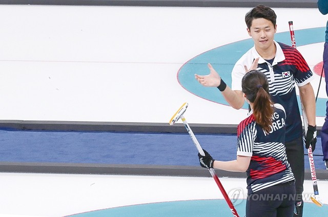 2018 평창올림픽 개막을 하루 앞둔 8일 오전 강릉컬링센터에서 열린 컬링 믹스더블(혼성 2인조) 예선 1차전 한국 대 핀란드 경기에서 이기정과 장혜지가 승리를 확정 지은 뒤 기뻐하고 있다.