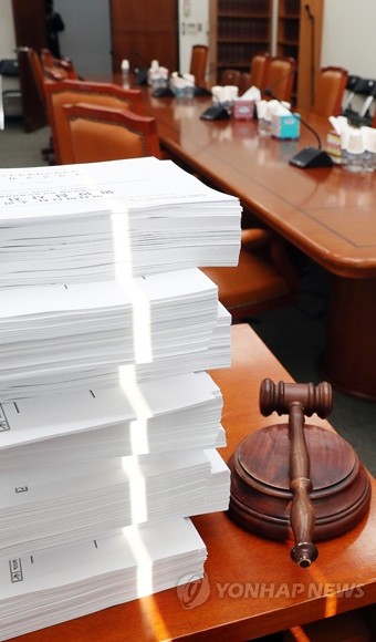 8일 오전 행정안전위원회의 행정 및 인사법심사소위원회가 열리지 못한 가운데 국회 본청 소위원회 회의실에 각종 심사법안 자료만 쌓여있다. 전날 자유한국당은 향후 예정된 국회 상임위원회 일정을 전면 보이콧 하기로 했다. 한국당의 보이콧 결정은 더불어민주당이 강원랜드 채용비리 수사 외압 의혹에 휩싸인 자당 소속 권성동 법사위원장의 사퇴를 요구하면서 법사위를 포함해 국회가 부분 파행을 빚어온 것과 관련된 것으로 보인다.