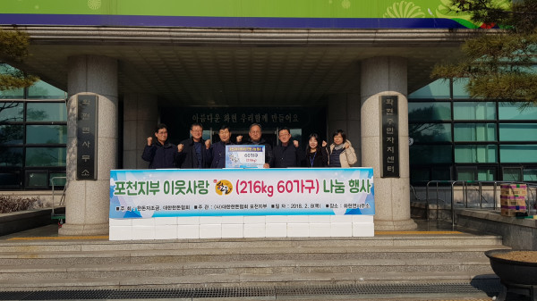 최근 경기 포천시 대한한돈협회는 설 명절을 맞이해 지역에서 직접 키운 돼지고기 216kg(300만원 상당)을 시를 통해 화현면 60가구에 기부했다. 사진은 돼지고기 기부를 기념해 협회 관계자들이 기념촬영을 하는 모습. (사진제공=포천시청)