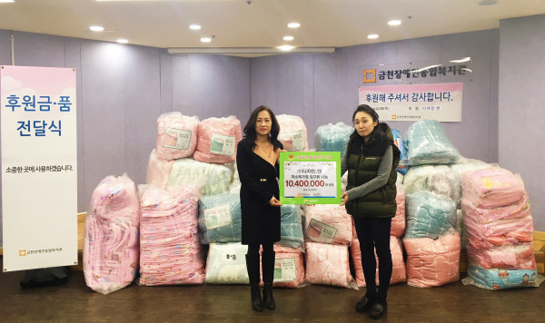 금천구는 8일 금천장애인종합복지관에서 (주)디자인-엔과 사회공헌활동 전달식을 개최했다. 이날 (주)디자인-엔은 이불, 베개커버 등 1000만원 상당의 침구류 1445점을 금천장애인종합복지관, 사랑의지역아동센터 등에 기부했다. 사진은 관계자들이 기념촬영을 하는 모습. (사진제공=금천구청)