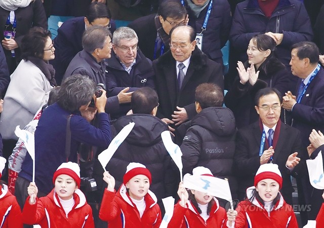 문재인 대통령이 10일 오후 강원도 강릉 관동하키센터에서 열린 2018 평창동계올림픽 여자 아이스하키 B조 조별리그 1차전 남북단일팀과 스위스의 경기에서 북한 김정은 국무위원장 특사 자격으로 방남한 김여정 중앙위원회 제1부부장(오른쪽 두번째)과 대화하고 있다. 왼쪽부터 문 대통령, 토마스 바흐 IOC 위원장, 김영남 최고인민회의 상임위원장, 김여정, 이희범 조직위원장.