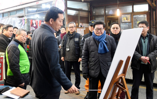 지난 9일 오전 광진구청 및 광진소방서 관계자 등이 전통시장 민관합동 안전점검을 위해 자양전통시장을 방문했다. 사진은 구청장이 구 안전치수과장으로부터 현황보고를 받는 모습. (사진제공=광진구청)