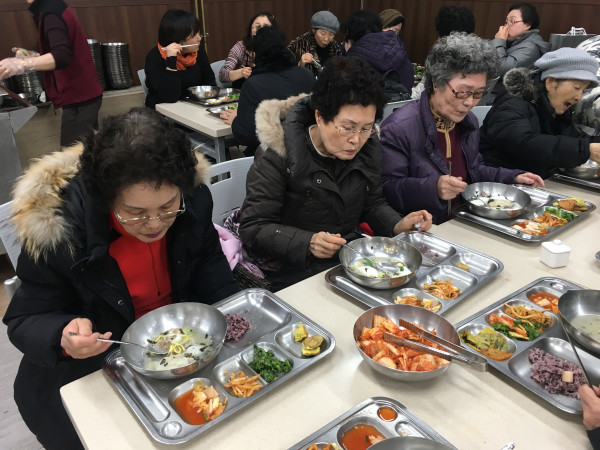 최근 양천어르신종합복지관은 설을 맞이해 한국전력 강서양천지사의 후원으로 지역내 저소득 홀몸 노인을 대상으로 ‘2018년 설맞이 떡국 나눔 행사’를 마련했다. 사진은 행사에 참여한 노인들이 떡국을 먹고있는 모습. (사진제공=양천어르신종합복지관)