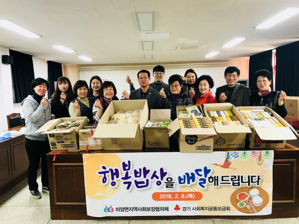 최근 경기 안성시 미양면 지역사회보장협의가 설을 맞이해 지역내 복지사각지대에 있는 이웃을 대상으로 ‘행복밥상 꾸러미’를 전달하는 행사를 진행했다. 사진은 행복밥상 꾸러미 전달에 앞서 관계자들이 기념촬영을 하는 모습. (사진제공=안성시청)
