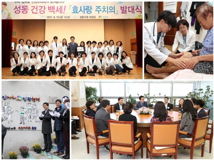 | ▲ (왼쪽 상단부터 시계방향으로)‘효사랑 주치의’ 발대식에서 주치의로 참여하는 의사·간호사 등 관계자들이 기념촬영을 하는 모습, ‘효사랑 주치의’가 지역내 노인 가구를 방문해 진찰을 하고 있는 모습, 구청을 방문한 주민자치사업단과 구 관계자들이 면담을 하는 모습, 행당1동 주민자치회 출범식에 참여한 구 관계자들이 박수를 치고 있는 모습.(사진제공=성동구청) | ||
