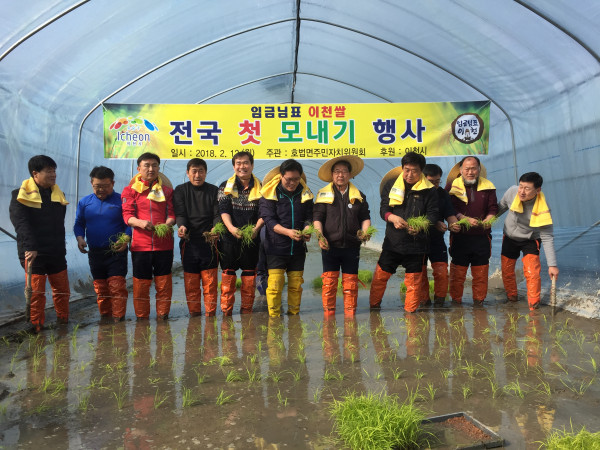 2018년 전국 첫 모내기가 12일 경기 이천시 호법면 안평 3리 뜰에서 실시됐다. 이천 호법면 자치위원회 주최로 열린 모내기에서는 하우스 2개동(면적 892㎡)에 조생종이 심어졌다. 사진은 참여자들이 모를 들고 기념촬영을 하는 모습. (사진제공=이천시청)