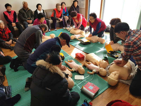 경기 안산시 단원보건소 대부보건지소는 지난 7~9일 농한기 경로당에 모이는 노인을 대상으로 ‘너도나도 해피100세 어르신 건강관리교실’을 운영했다. 사진은 노인들이 심폐소생술 실습을 하고 있는 모습. (사진제공=안산시청)