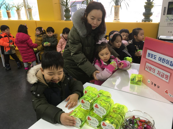 서울 강동구 명일1동에 소재한 고우리어린이집·청포도어린이집 원아들이 최근 불우한 이웃을 위해 ‘사랑의 저금통’ 98개를 명일1동 주민센터에 전달했다. 사진은 저금통 기부를 마친 원아가 자신이 전달한 저금통을 살펴보고 있는 모습. (사진제공=강동구청)