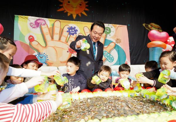 서울 강서구가 지난 13일 강서구민회관 우장홀에서 6개월간 국·공립어린이집과 민간어린이집 원생들이 정성껏 모은 성금을 전달하는 ‘작은손·큰나눔 사랑의 저금통 전달식’을 개최했다. 사진은 저금통 전달식에 참석한 어린이집 원생들이 저금통을 개봉해 동전을 모으고 있는 모습.(사진제공=강서구청)