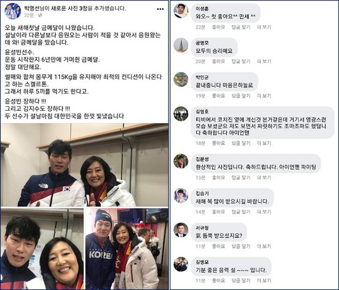 스포츠광으로 유명한 박영선 의원은 “오늘 새해첫날 금메달이 나왔습니다. 설날이라 다른날보다 응원오는 사람이 적을 것 같아서 응원왔는데 와! 금메달을 땄습니다. 윤성빈선수. 운동 시작한지 6년만에 거머쥔 금메달. 정말 대단해요. 썰매와 합쳐 몸무게 115Kg을 유지해야 최적의 컨디션이 나온다고 하는 스켈르톤. 그래서 하루 5끼를 먹기도 한다고. 윤성빈 장하다!!! 그리고 김지수도 장하다 !!! 두 선수가 설날아침 대한민국을 한껏 빛냈습니다”라는 글을 올려 감동을 선사하고 있다.