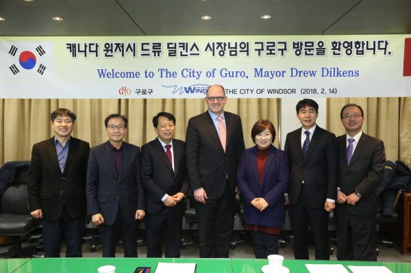구로구와 지난해 9월 우호교류 협약을 맺은 캐나다 온타리오주 윈저시 시장이 최근 구를 방문해 양 도시 간 교류협력 방안에 대해 논의했다. 사진은 간담회 후 기념촬영을 하고 있는 관계자들의 모습. (사진제공=구로구청)