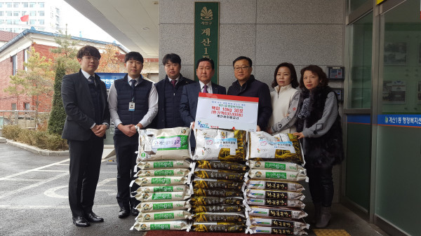 인천 계양구에 위치한 계산새마을금고는 지난 14일 설 명절을 맞아 계산1동 행정복지센터를 방문해 백미 10kg·30포를 전달했다. 사진은 관계자들이 기념촬영을 하는 모습. (사진제공=계양구청)