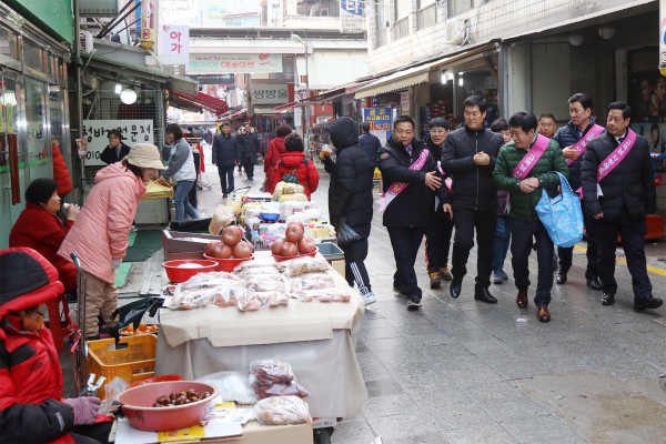 경기 용인시청 직원 20여명은 설 명절을 앞두고 지난 14일 오후 김량장동에 위치한 용인중앙시장을 방문해 명절음식과 차례상을 차리는 데 필요한 물품을 구매하는 등의 장보기 행사를 진행했다. 사진은 장보기 행사에 참여한 관계자들이 시장 상인들과 인사를 나누는 모습. (사진제공=용인시청)