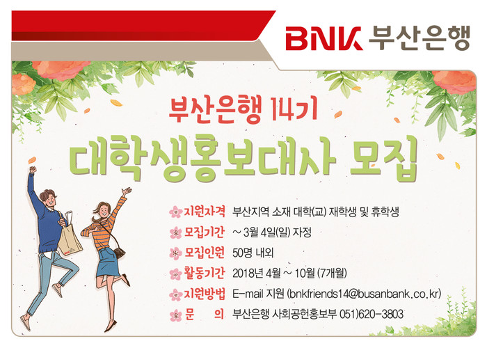 부산은행 대학생 홍보대사 ‘BNK프렌즈’는 부산지역 소재 대학(교)에 재학 또는 휴학중인 학생이면 누구나 지원 가능하며 서류심사와 면접을 거쳐 50여명을 선발한다.