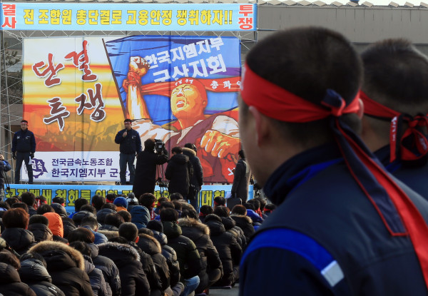 | ▲ 전국금속노조 한국지엠지부 군산지회 조합원들이 14일 오전 한국GM 전북 군산공장에서 집회를 열고 공장 폐쇄를 철회할 것을 요구하고 있다.(사진제공=연합뉴스) | ||