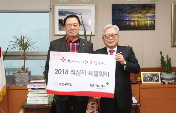 최근 서울 성동구의회는 대한적십자사 서울지사 및 대한적십자봉사회 성동구협의회의 임직원 등이 참석한 가운데 ‘적십자특별회비 전달식’을 열고 대한적십자사 서울지사에 적십자특별회비를 전달했다. 사진은 전달식에 참석한 관계자들이 기념촬영을 하는 모습. (사진제공=성동구의회)