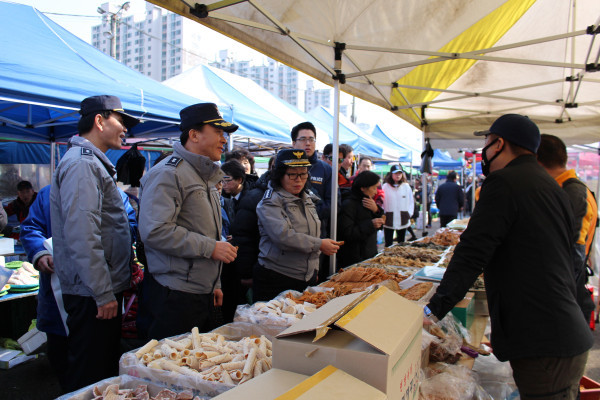 최근 경기 김포경찰서는 치안현장 점검과 함께 전통시장 경기 활성화를 독려한다는 취지에서 생활안전협의회 및 자율방범대 관계자 등과 함께 북변동 공영주차장에서 열린 김포5일장터를 현장방문했다. 사진은 경찰서 관계자들이 시장 상인들과 이야기를 나누는 모습. (사진제공=김포경찰서)