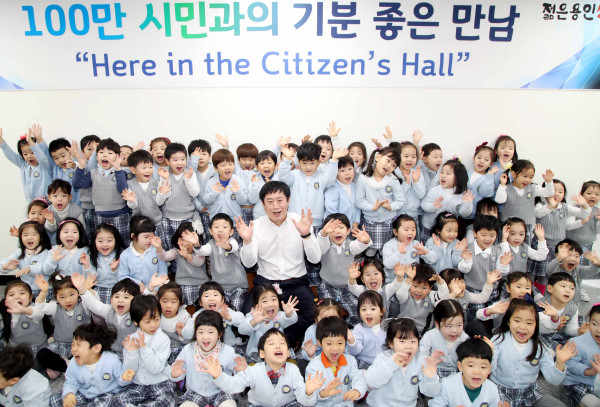 19일 경기 용인시‘행복한유치원’ 원생과 원장, 교사 등 80여명이 바자회 수익금 121만6230원을 저소득층 어린이를 돕는 ‘디딤씨앗통장’에 기부했다. 사진은 용인시장과 기념촬영을 하고 있는 아이들의 모습. (사진제공=용인시청)