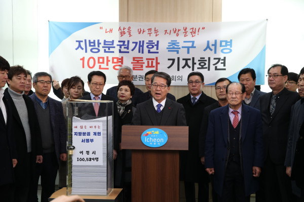 경기 이천시는 19일 오전 시청 브리핑룸에서 지방분권개헌 이천회의 주도로 ‘지방분권 개헌 촉구 1000만인 서명운동’을 통해 마련한 10만589명의 서명부를 공개하고, 지방분권 개헌 촉구 결의문을 낭독하는 등의 결의대회를 진행했다. 사진은 결의대회에 참석한 관계자들의 모습. (사진제공=이천시청)