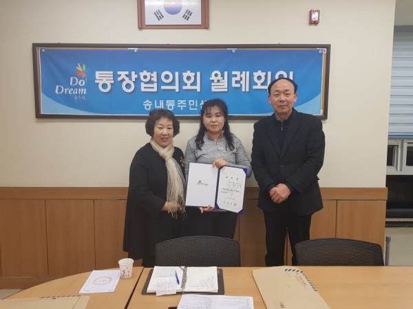 경기 동두천시 송내동 행정복지센터는 19일에 개최된 통장협의회 월례회의에서 신규 위촉된 송내동 7통장에게 위촉장을 수여했다. 사진은 관계자들이 기념촬영을 하는 모습. (사진제공=동두천시청)