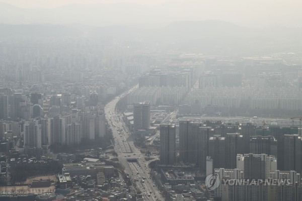 미세먼지 '한때 나쁨'을 보인 20일 오전 서울 송파구 롯데월드타워에서 바라본 서울 시내가 뿌옇다.
