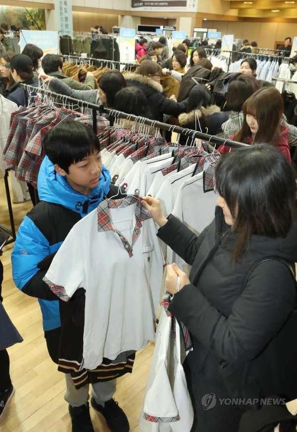 21일 오전 서울 서대문구청에서 열린 '2018 서대문구 교복 나눔장터'에서 학생들이 교복을 고르고 있다. 이날 행사에서는 가재울중, 신연중, 연북중 등 지역 6개 중학교 졸업생들과 재학생들로부터 기증받은 1200점의 교복 등을 구청이 깨끗하게 세탁해 겨울 재킷 5000원, 카디건 4000원, 그 밖의 조끼, 셔츠 등은 3000원에 판매했다.